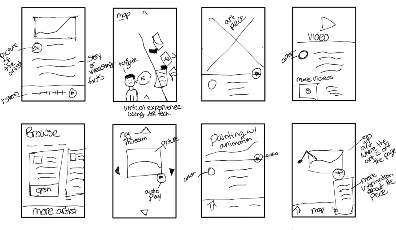 After looking at my sketches, I decided on one approach that best solved the problem of consumers going to the art museum. Then, I illustrated features that started from the beginning to the end of the frame to make it cohesive. Overall, the goal was to have one solution to focus on for the remainder of the sprint.