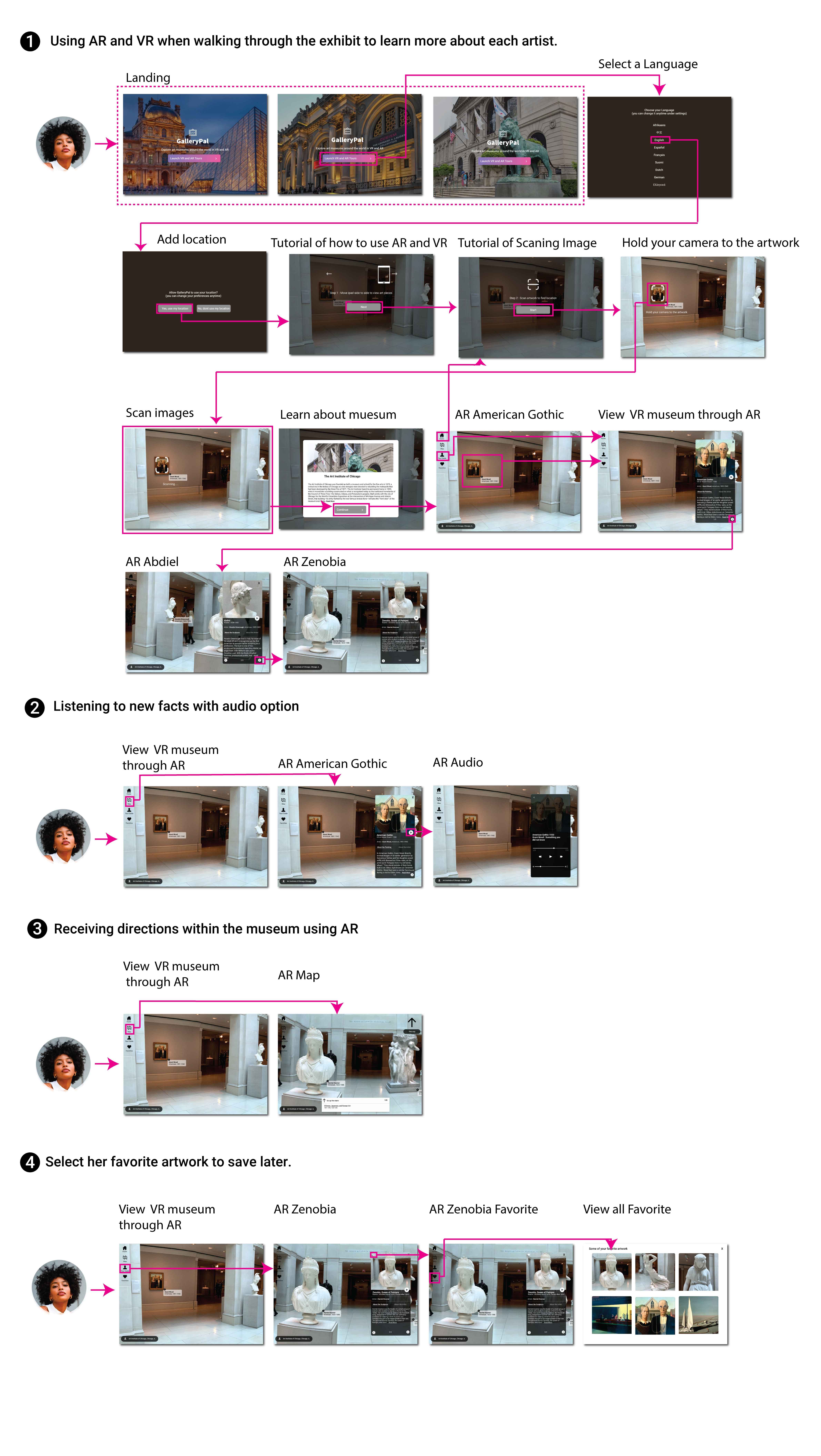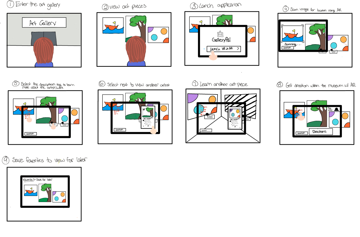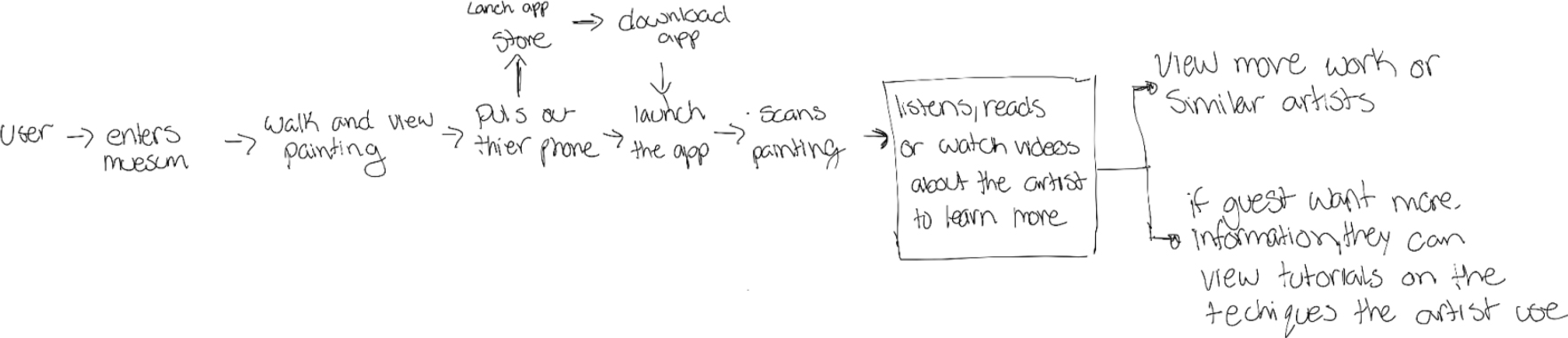 She would use Art-detecting (AR) and Virtual reality (VR) when walking through the exhibit to learn more about each artist. Also, receive directions within the museum, have audio options to listen to a tour guide, and select her favorite artwork to save later.