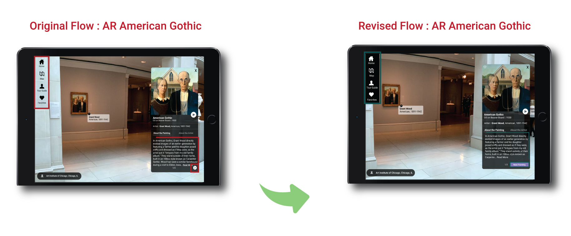 Expanding the prototype. A participant mentioned they would love to learn more about how the art piece came to the museums (a little more history). They also said that some tour apps have mini podcasts and would love to see them in the application.Â