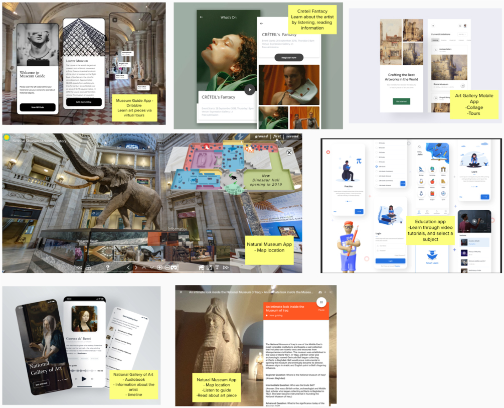 I began by looking into Dribbble, Google, and Pinterest to find some inspiration that either was simple (context, video, and audio sound) or more complex (AR, VR, and AI). Both views caught my eye, and I made them into a collage and added sticky notes with notes.