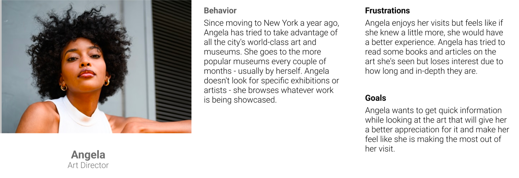 Angela wants a self-paced tour to browse through the gallery with the data collected. Her goal is to receive information about the artist without feeling she has missed anything.