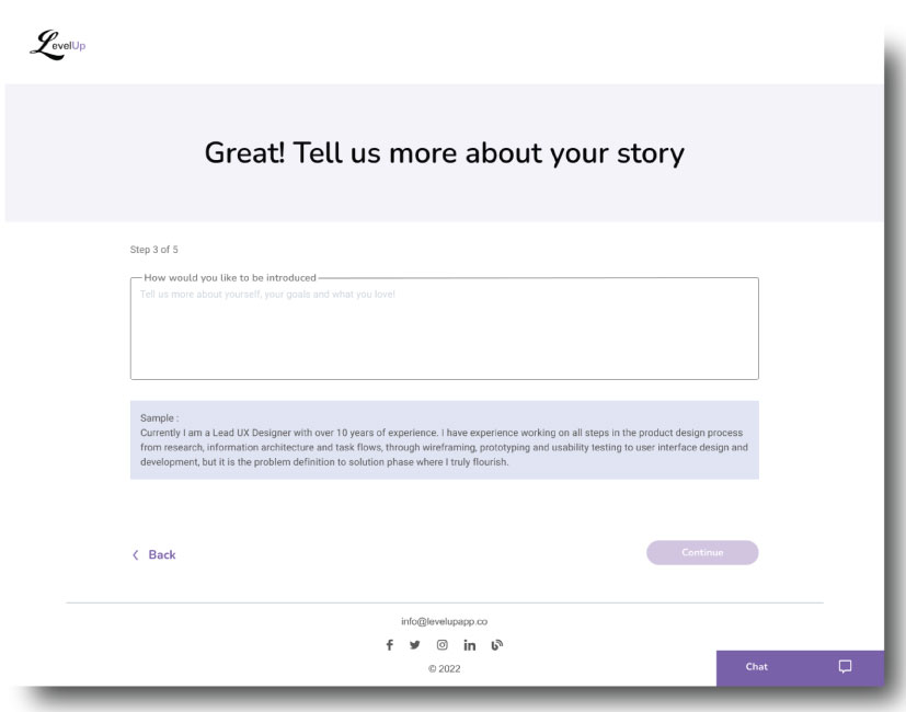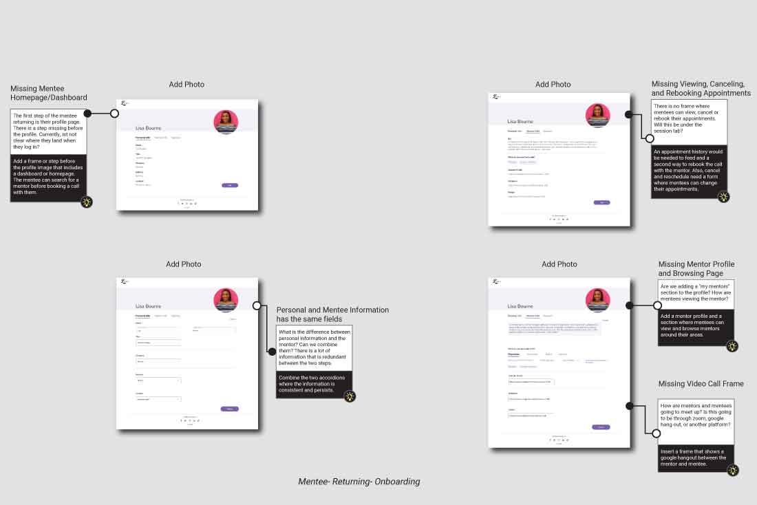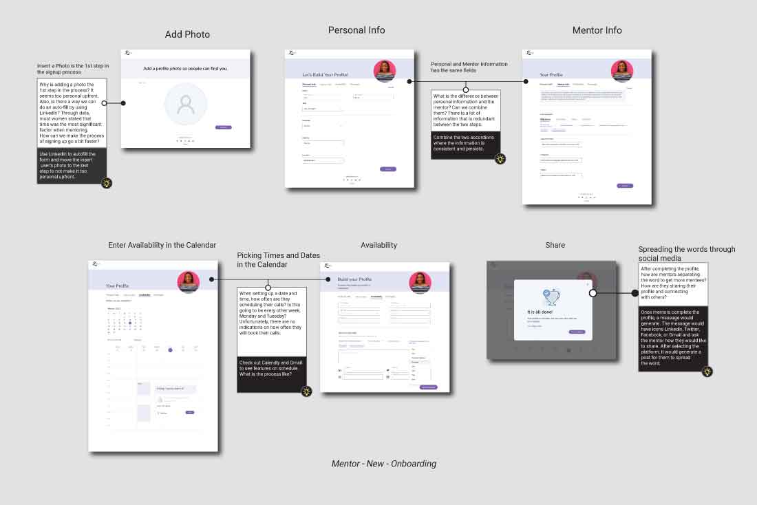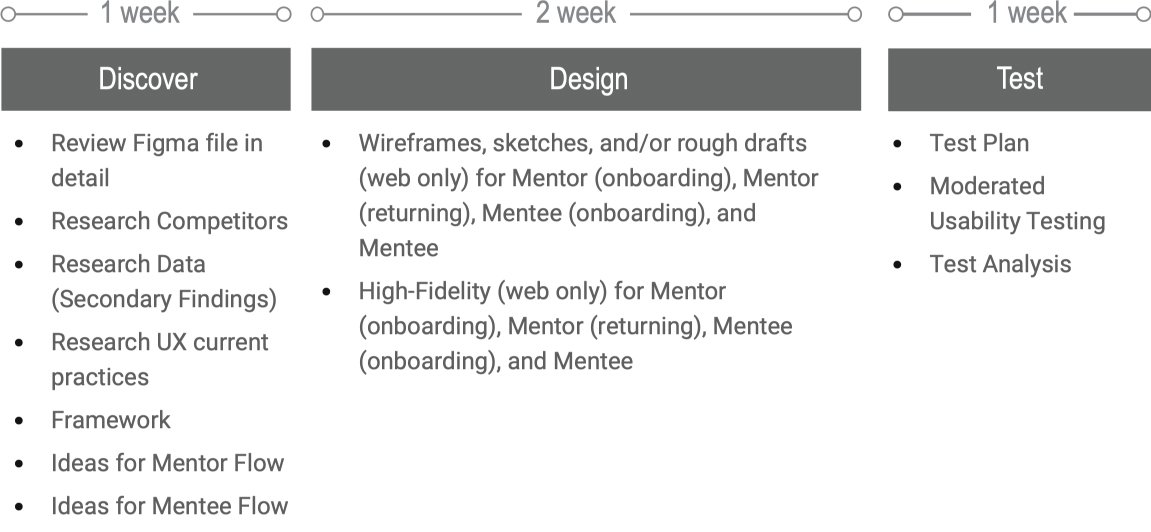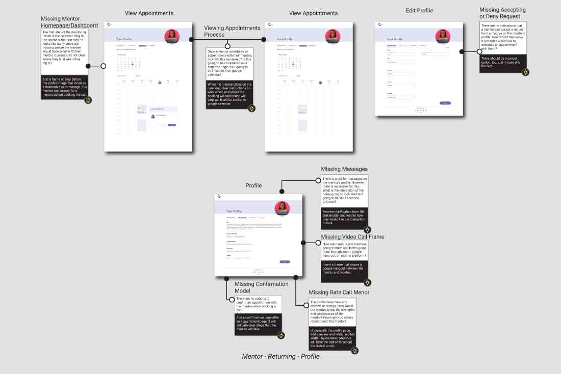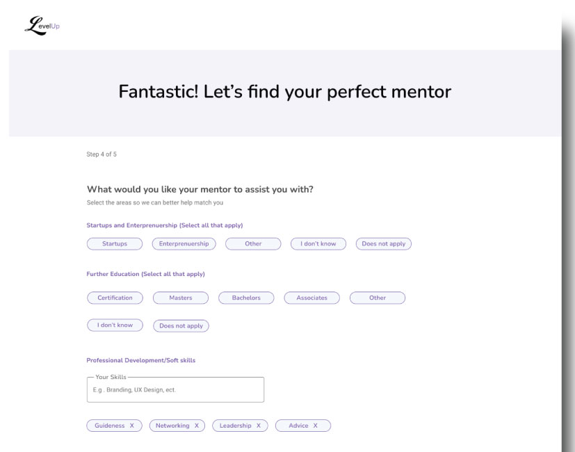 Currently, Level Up is building out its Minimum Viable Product (MVP) and wants the UX team to fine-tune and flesh out both mentor/mentee flows, prototype, and test them to ensure it meets the goals of both users seeking this type of platform. They want it to be easy, seamless, and efficient and meet the needs of both their mentors and mentees.