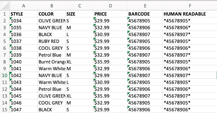 Variable Data Setup: Next, I set up a data file with product information, including size, color, SKU, and price, to simulate a real variable data workflow. If preparing for print, I would add blank columns and rows to ensure proper make-ready formatting.